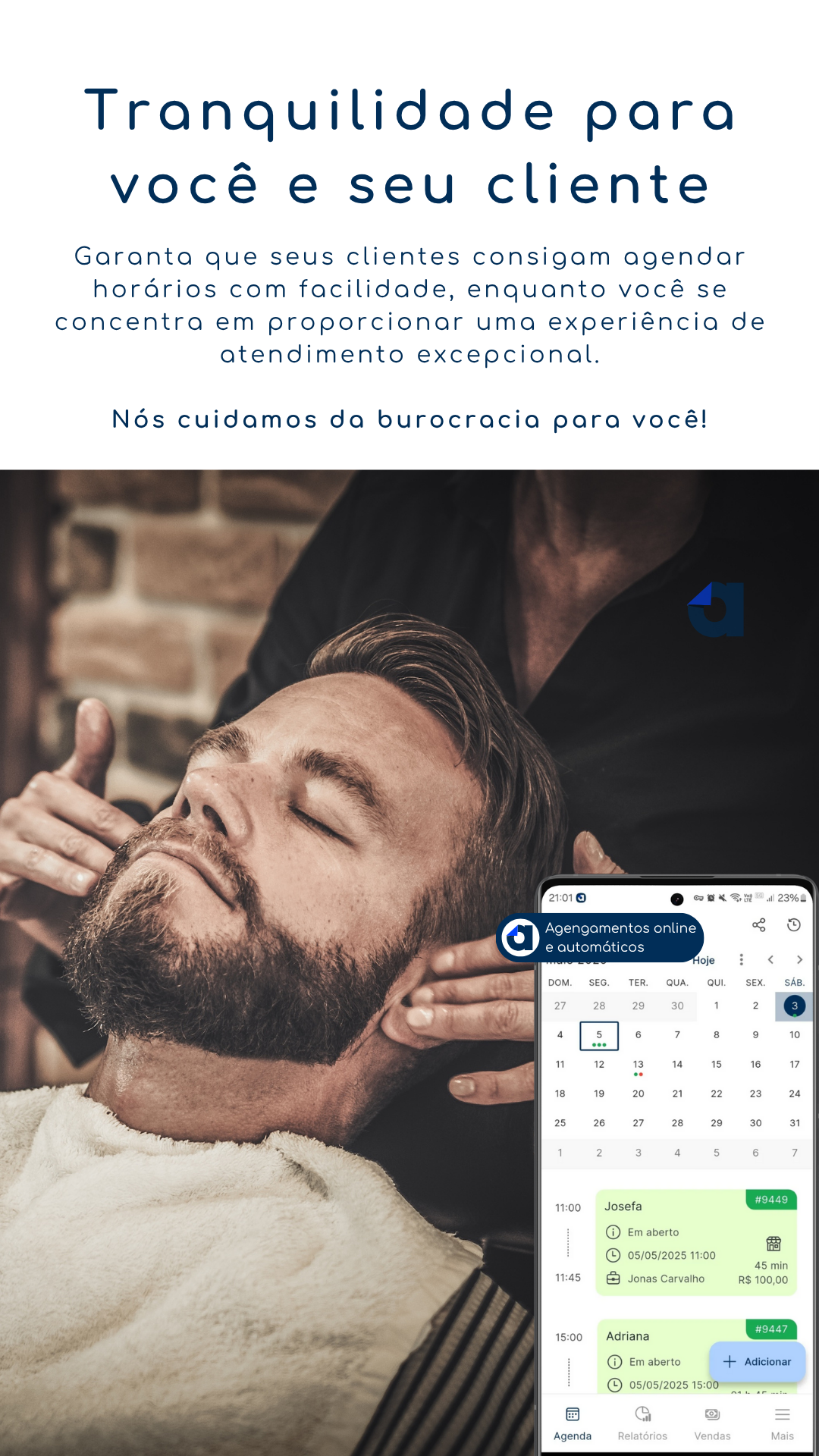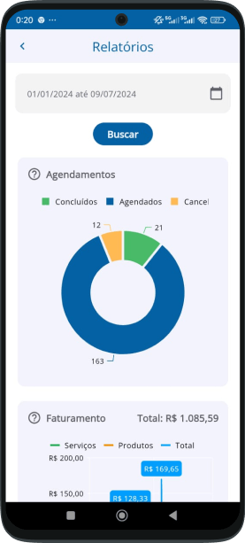 Consulte informações importantes sobre o desempenho do seu negócio, relatórios sobre agendamentos, serviços, clientes e muito mais!