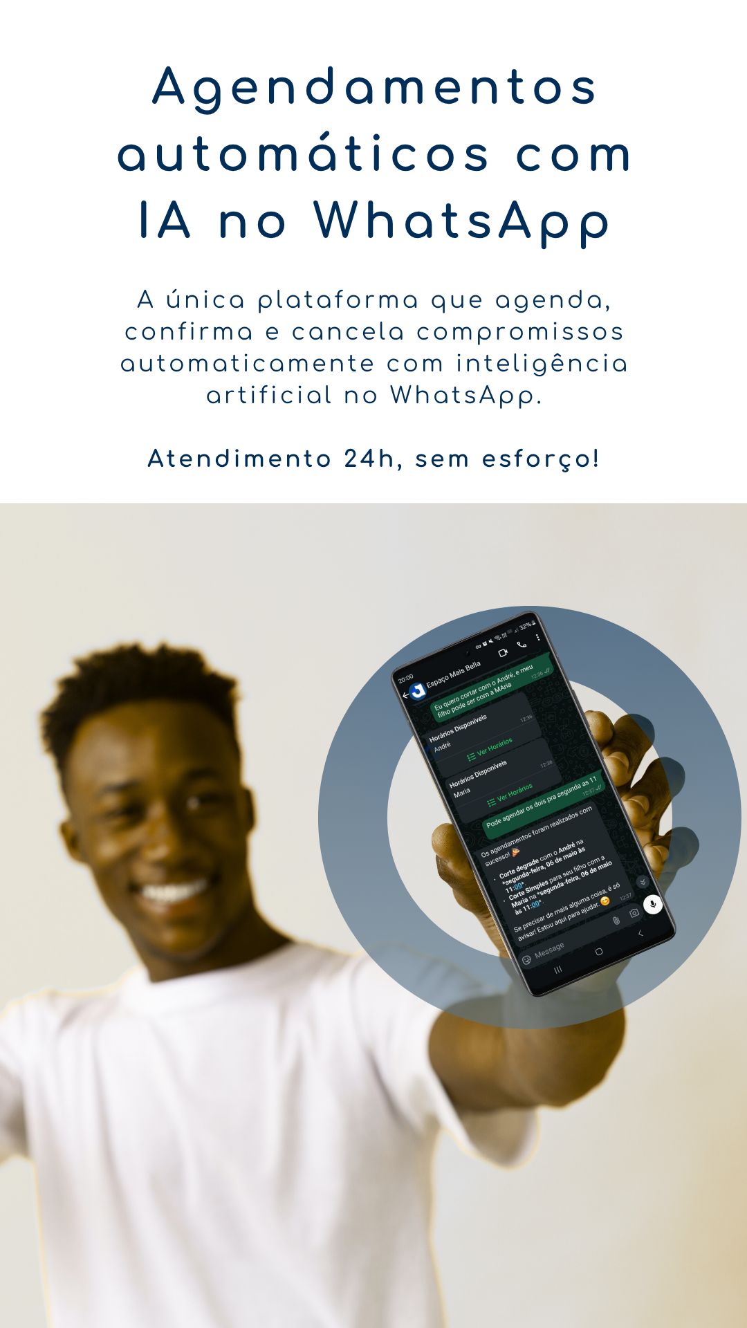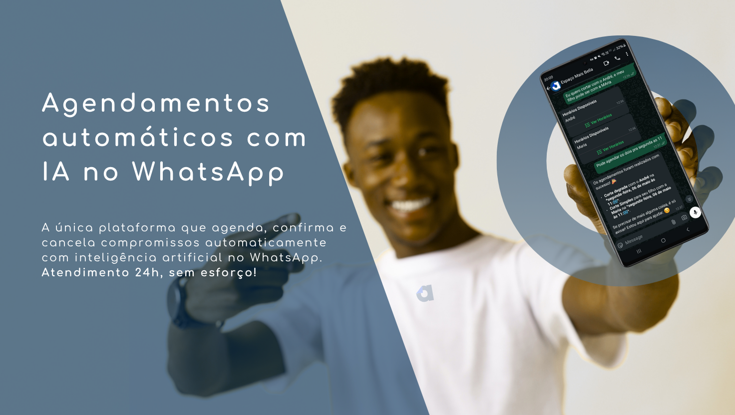 Com a Agendese, você automatiza todo o processo de agendamento pelo WhatsApp. Nossa IA entende o que o cliente quer, oferece horários disponíveis, confirma, envia lembretes e até cancela agendamentos. Tudo sem intervenção humana.